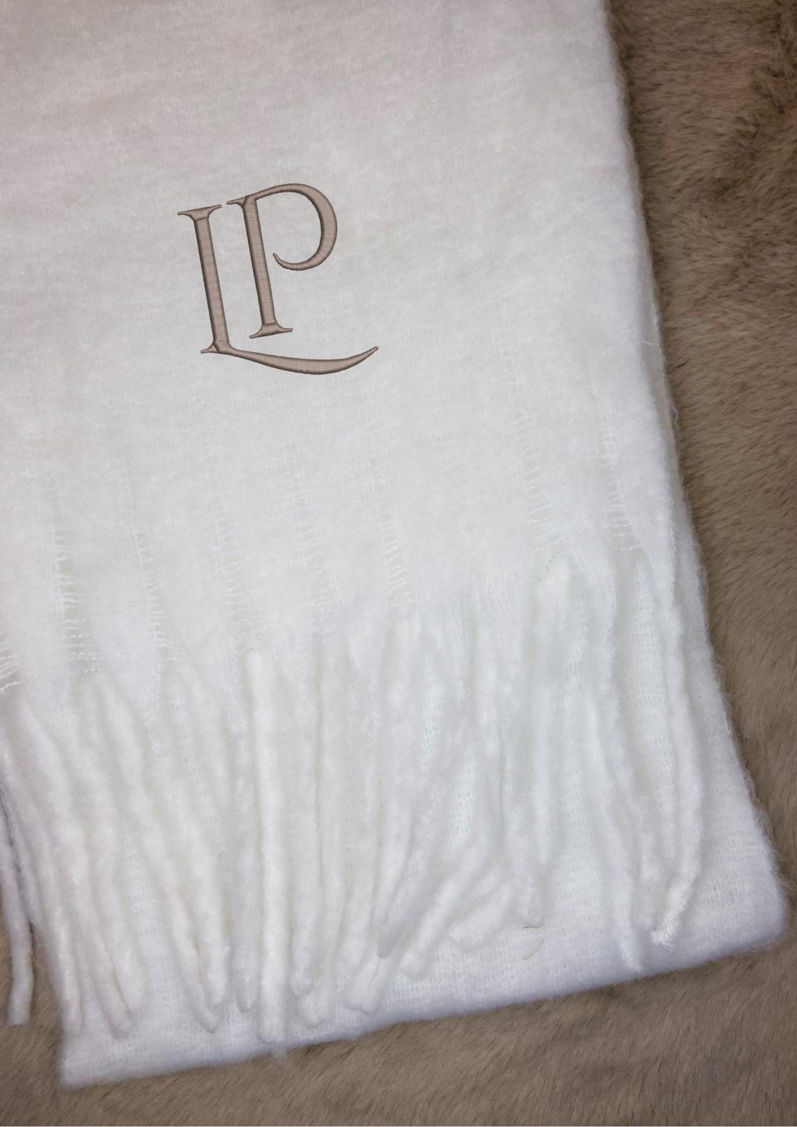 Chaque écharpe est personnalisée par broderie avec le prénom, les initiales ou un mot doux, pour un rendu raffiné et unique.